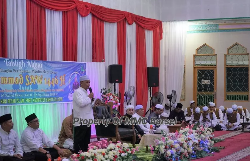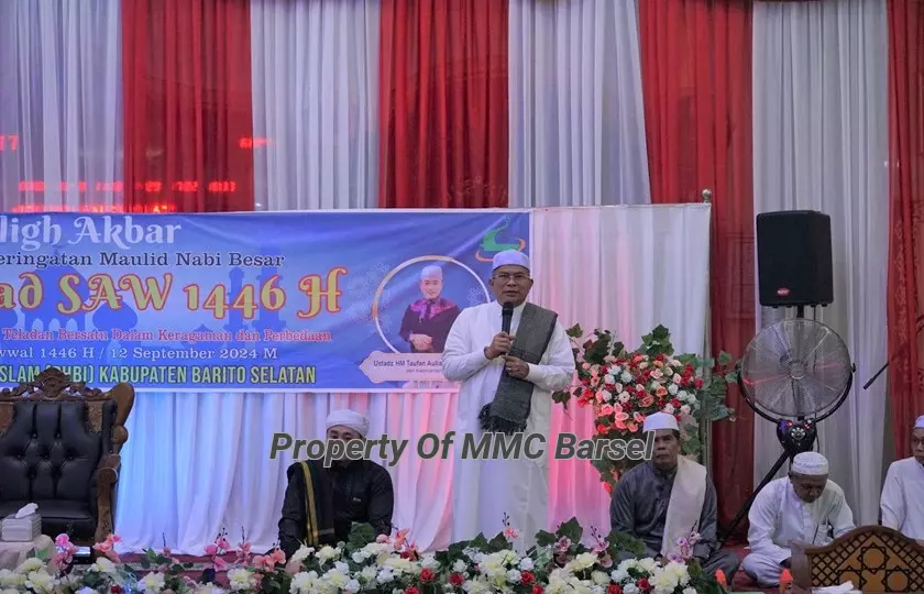 MMCBarsel-BUNTOK-Tablik akbar peringatan Maulid Nabi Muhammad SAW menghadirkan penceramah AL-Ustadz H. M Taufan Aulia Akbar dengan mengusung tema "Kepemimpinan Rasulullah Teladan Bersatu dalam Keragaman dan Perbedaan" yang dihadiri oleh Asisten Perekonomian dan Pembangunan Rahmat Nuryadin mewakili Pejabat (PJ) Bupati Barito Selatan H.Deddy Winarwan bertempat di Masjid Agung Baiturrahman Buntok, Kamis (12/9/2024)