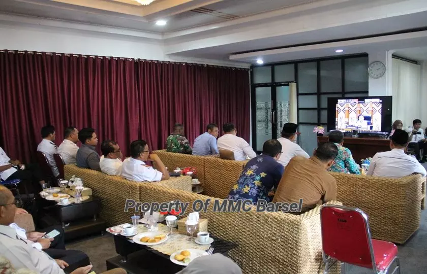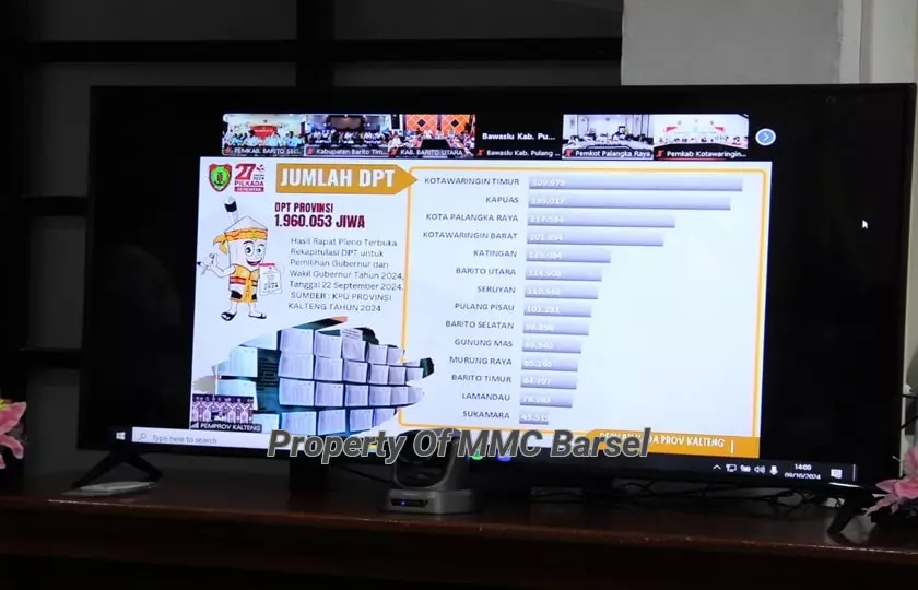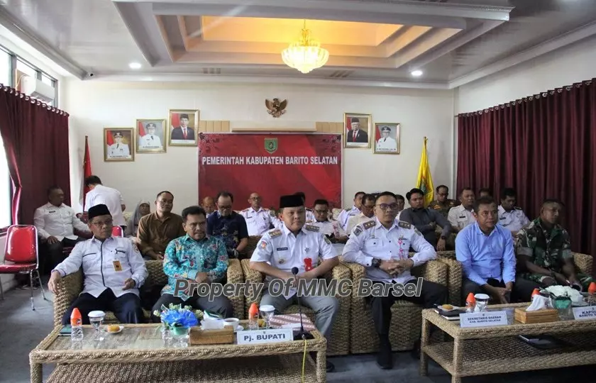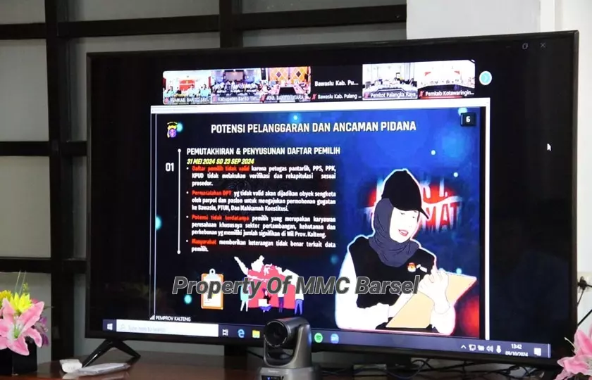 MMCBarsel-Buntok- Berkoordinasi dengan berbagai pihak untuk memastikan kelancaran pelaksanaan pemungutan suara terkait kesiapan pelaksaan Pilkada pada masing-masing kabupaten di Provinsi Kalimantan Tengah, Komisi Pemilihan Umum (KPU) Prov Kalteng menggelar rapat melalui zoom meeting di ruang rapat VIP Sekretariat Daerah (Setda) Kabupaten Barito Selatan (Barsel), Rabu (9/10/2024). Zoom meeting dihadiri oleh Penjabat (Pj) Bupati Barito Selatan H.Deddy Winarwan, Sekretaris Daerah Kab Barsel, asisten, kepala perangkat daerah, komisioner KPU Kab Barsel serta Bawaslu.