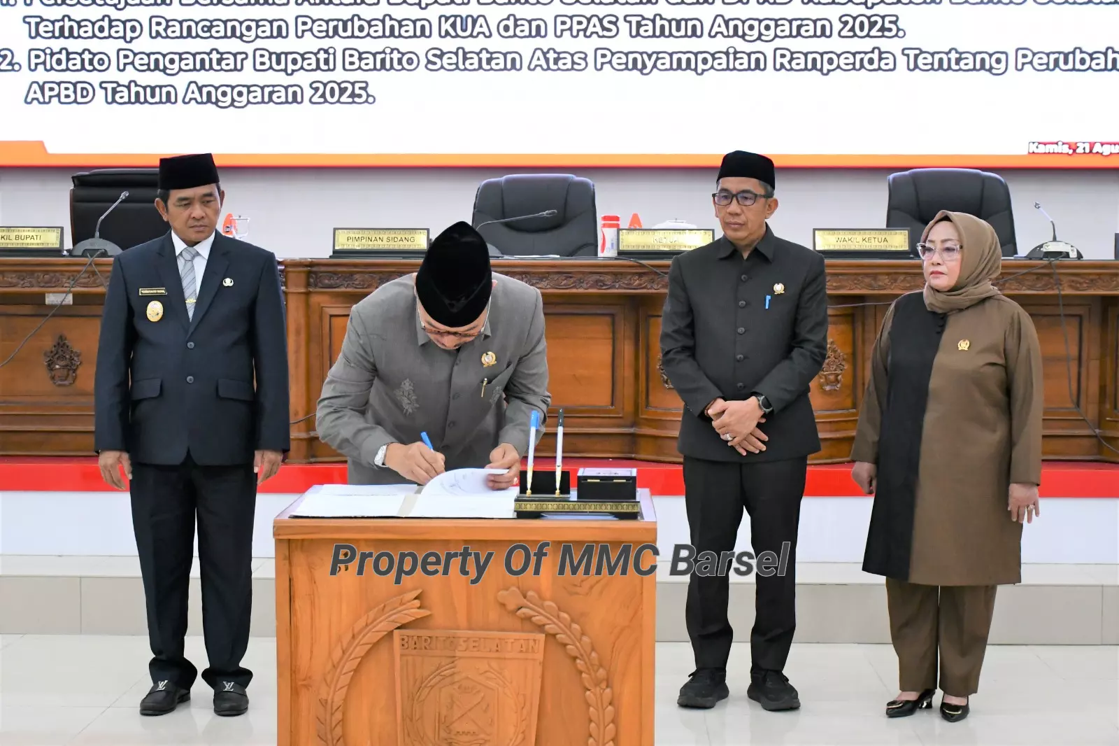 MMCBarsel-Buntok-Wakil Bupati (Wabup) Barito Selatan (Barsel) Khristianto Yudha menyampaikan persetujuan bersama terhadap Rancangan Perubahan KUA-PPAS Tahun Anggaran 2025 sekaligus Ranperda tentang Perubahan APBD 2025. Persetujuan tersebut disampaikan dalam Rapat Paripurna ke-26 Masa Sidang III Tahun 2025 di Graha Paripurna DPRD Barsel, Kamis (21/8/2025).