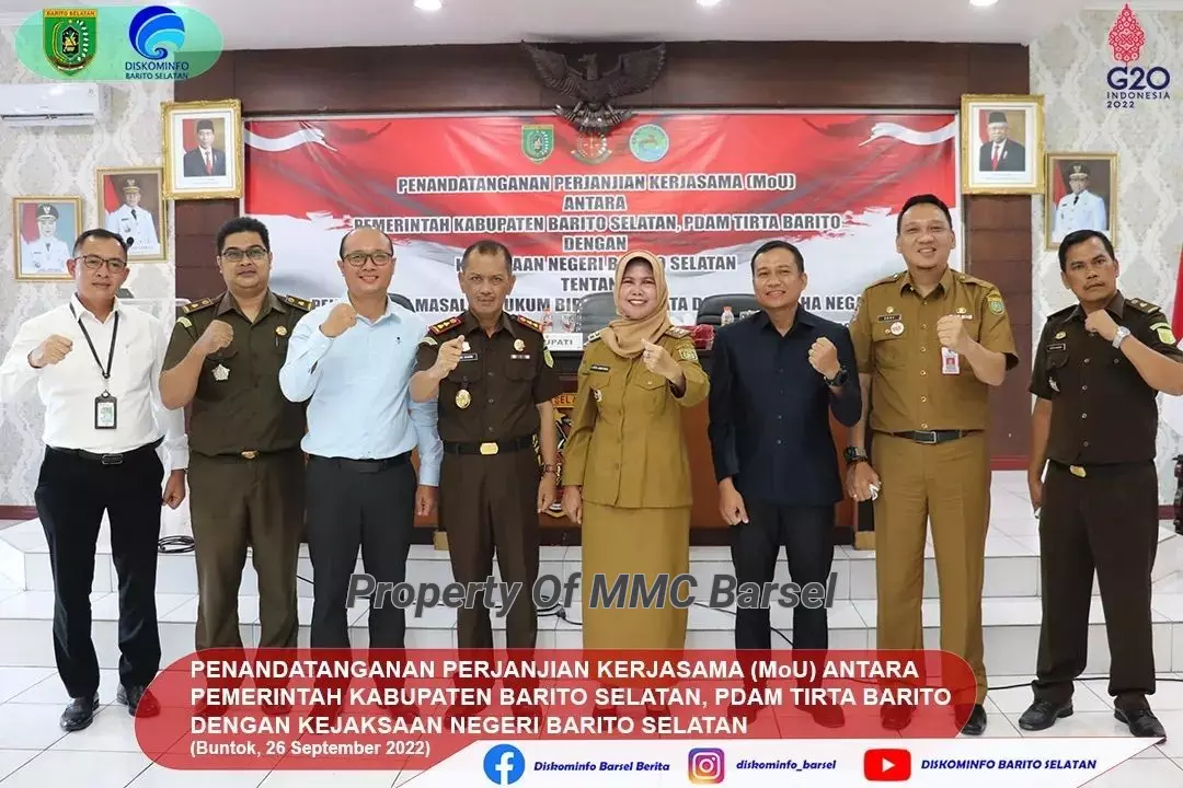Diskominfobarsel- Buntok, Pemerintah Kabupaten Barito Selatan (Barsel) melaksanakan Memorandum of Understanding (Mou)/Nota Kesepahaman) yaitu penandatanganan kerjasama antara pemerintah kab. Barsel, PDAM Tirta Barito dengan Kejaksaan Negeri Barito Selatan tentang Penanganan Masalah Hukum Bidang Perdata dan Tata Usaha Negara bertempat di Aula Setda kab. Barsel (Buntok, 26/09/2020).
