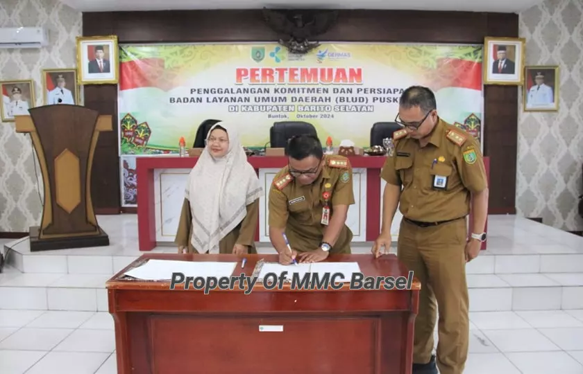 MMCBarsel-Buntok- Agar fleksibilitas, transparan, akuntibilitasi dan bisnis yang sehat dapat terwujud sehingga pelayanan publik terhadap masyarakat memuaskan, Pemerintah Kabupaten (Pemkab) Barito Selatan (Barsel) melalui Dinas Kesehatan (Dinkes) Kab Barsel menggelar penggalangan komitmen Badan Layanan Umum Daerah (BLUD), Puskesmas dan Labkesda bertempat di aula Kantor Bupati Barsel Buntok, Selasa (8/10/2024). Pertemuan dibuka oleh II Bidang Perekonomian dan Pembangunan Sekretariat Daerah Kab Barsel Rahmat Nuryadin dan dihadiri oleh narasumber yakni Kepala Bidang Kesehatan Masyarakat Dinkes Provinsi Kalteng dr. Ferry Irawan.