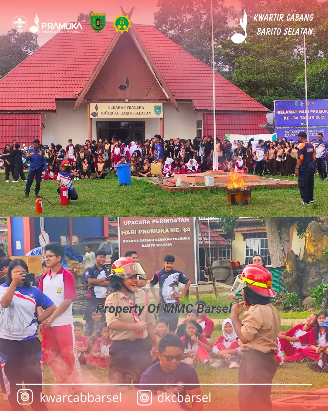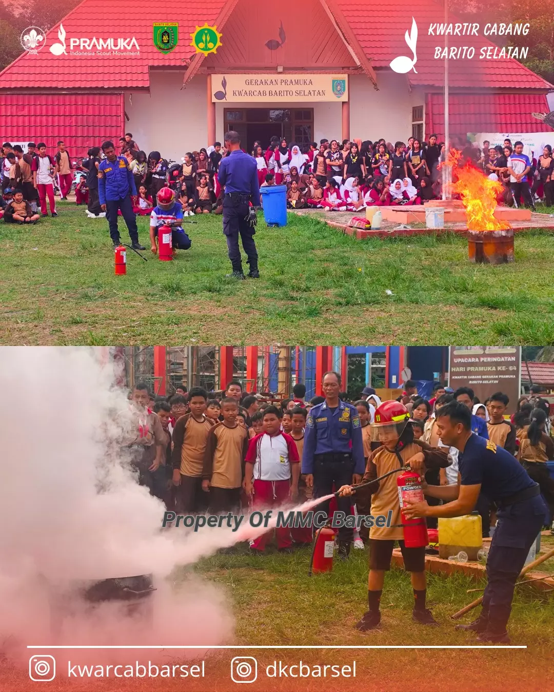 MMCBarsel-Buntok — Gerakan Pramuka Gugus Depan (Gudep) 025–026 SMPN 1 Dusun Selatan dan Gudep 019–020 SMPN 2 Dusun Selatan berkolaborasi dengan Dinas Pemadam Kebakaran dan Penyelamatan (Damkar) Kabupaten Barito Selatan dalam kegiatan sosialisasi pencegahan serta teknik pemadaman kebakaran, yang berlangsung penuh semangat dan edukatif. ( Jum'at, 24 Oktober 2025 )