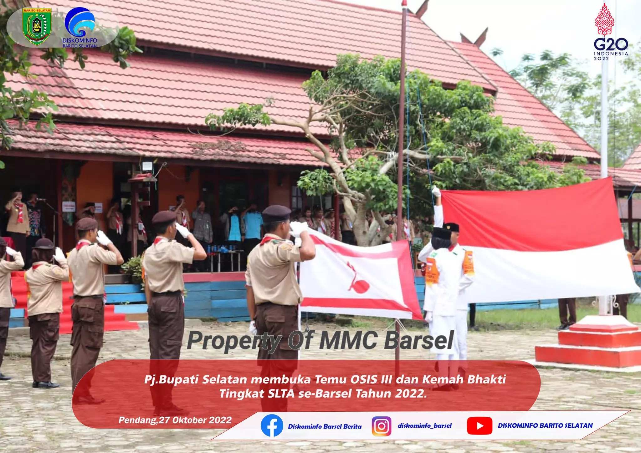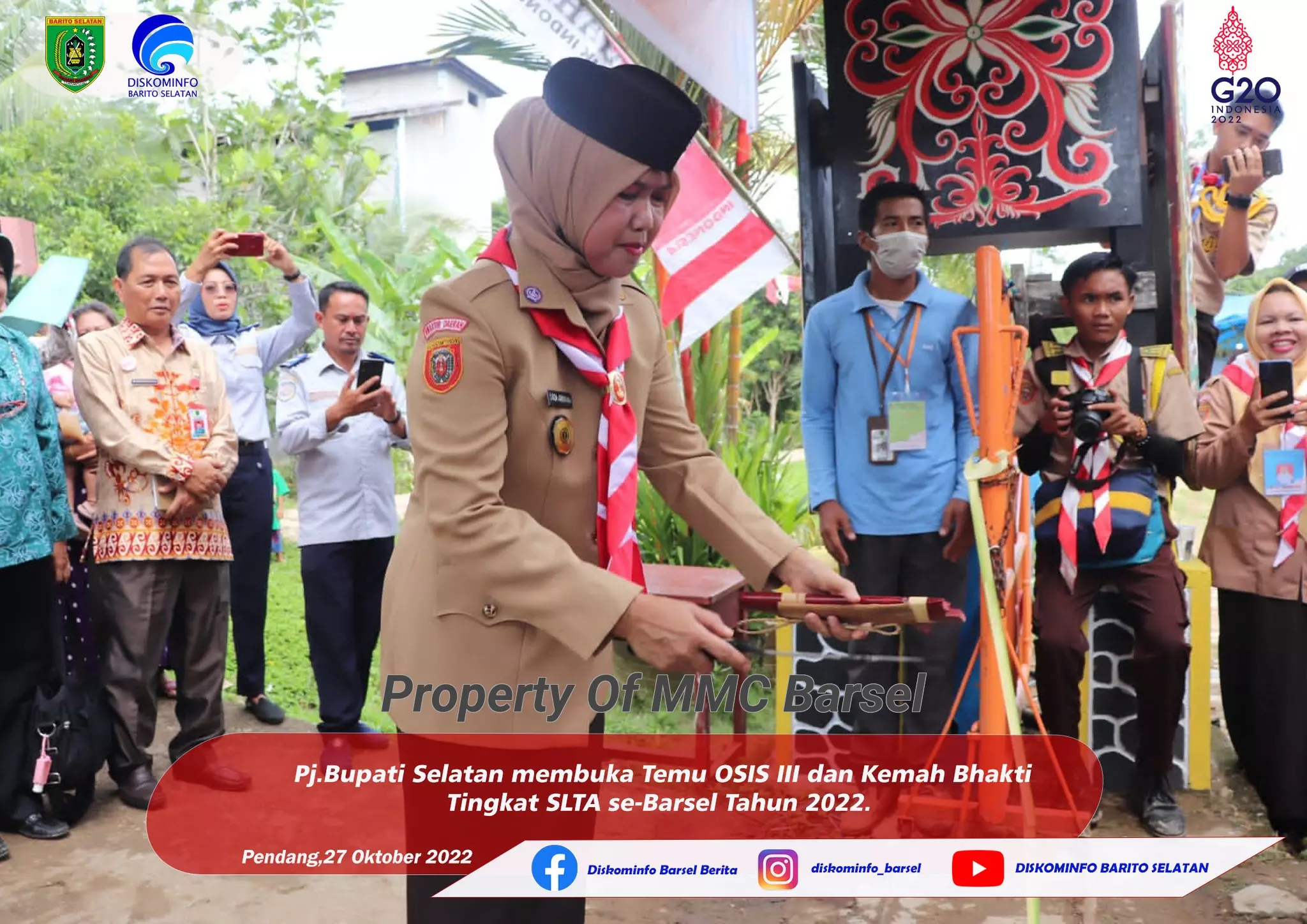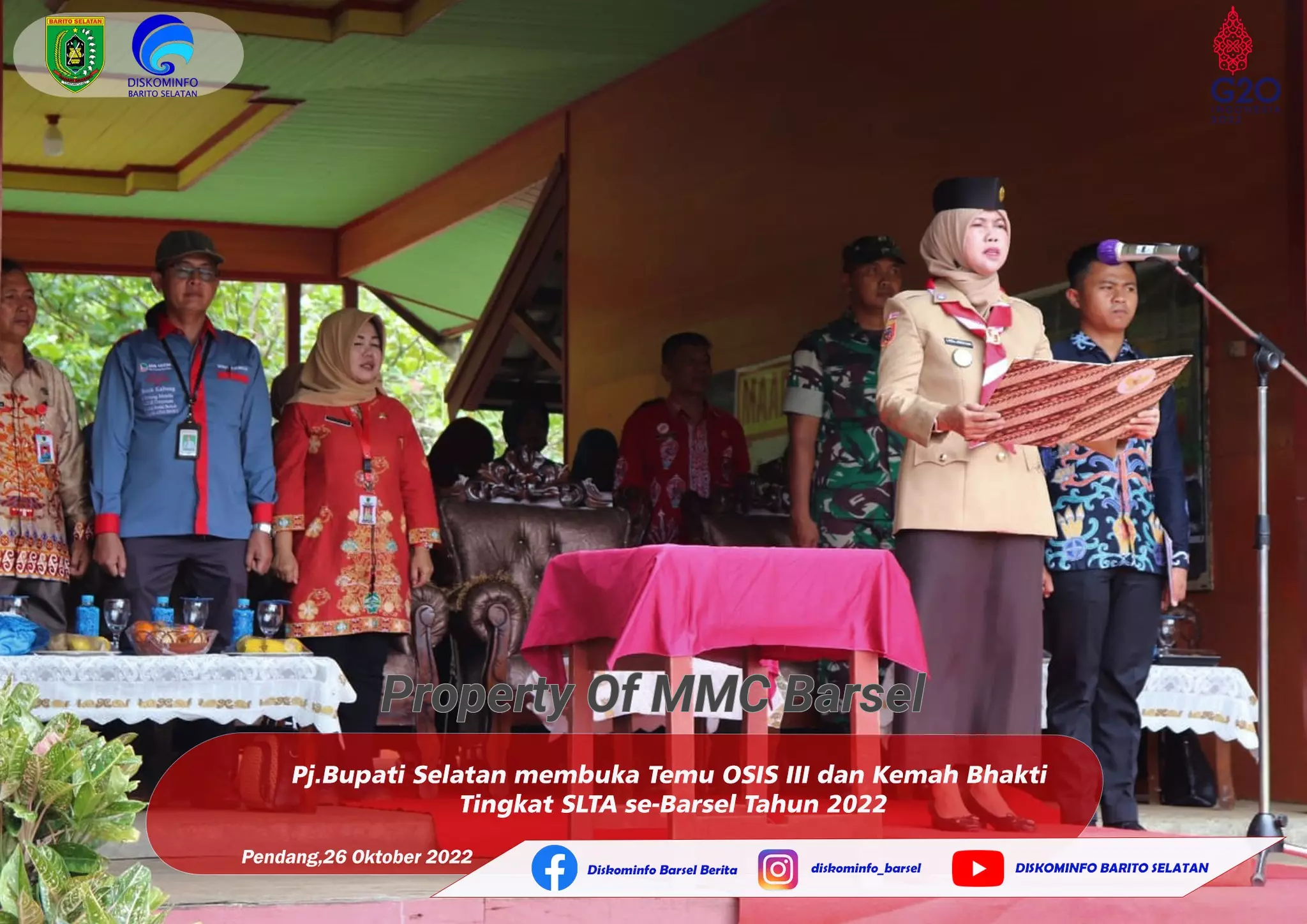 Temu Organisasi Siswa Intra Sekolah (OSIS) III tingkat SLTA dan Kemah Bhakti Pramuka Tingkat SLTA se Barito Selatan tahun 2022 dibuka secara resmi oleh penjabat Bupati Barito Selatan Lisda Arriyana selaku pembina upacara di lapangan Kelurahan Pendang Kecamatan Dusun Utara, Kamis (27/10).