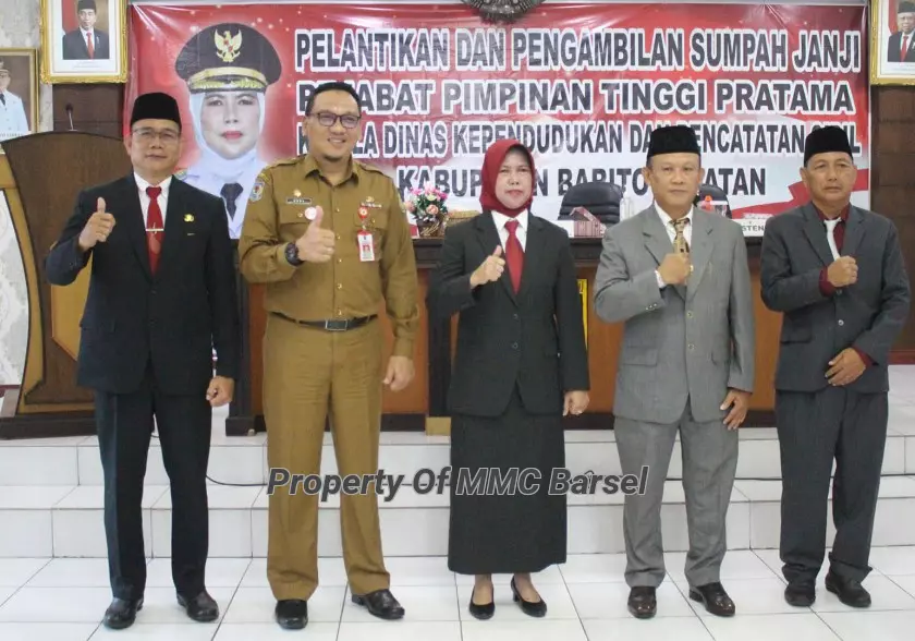 Buntok – Penjabat (Pj.) Bupati Barito Selatan (Barsel) Ibu Lisda Arriyana melantik dan mengambil sumpah jabatan Pimpinan Tinggi Pratama (Pejabat Struktural Eselon II) yaitu Kepala Dinas (Kadis) Kependudukan dan Pencatatan Sipil (Dukcapil) Kabupaten Barsel, Bapak Sabirin di Aula Sekretariat Daerah Kab. Barsel, Senin (19/12/2022) lalu.