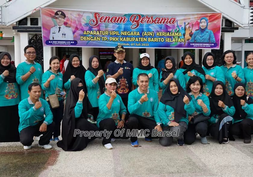 MMC Barsel – Buntok - Untuk meningkatkan kesehatan dan kebugaran jasmani Aparatur Sipil Negara (ASN), Pemerintah Kabupaten (Pemkab) Barito Selatan (Barsel) bekerja sama dengan TP-PKK Barsel menggelar senam bersama dan pemeriksaan kesehatan gratis di halaman Kantor Bupati Barsel, Jumat (7/7/2023).